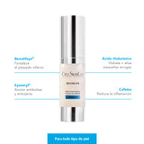 Crema para el contorno de los ojos, el cual se verá con menos bolsas por acumulo de líquidos gracias a la acción del péptido Eyeseril® que drena su exceso, con menos arrugas dada la acción de su activo Beautifeye® que mejora la elasticidad y suavidad de la piel, con menos ojeras oscuras porque moviliza los pigmentos que las producen y con menos ojeras por concavidad porque rellena gracias a la estimulación de la formación de colágeno.
