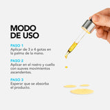 Usar cada mañana después de la limpieza, aplicando de 3 a 4 gotas en el rostro y cuello.