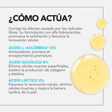 Serum de vitamina C pura en su forma más efectiva: Ácido L-Ascórbico, la opción inteligente para el cuidado de tu piel + AHA´s para una exfoliación suave.